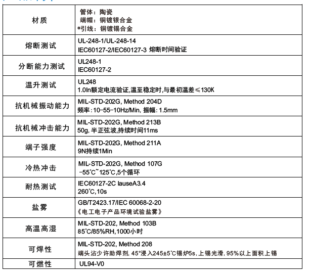 預期飛弧/熔斷時間,電流特性:當保險絲通以下述規定電流時,熔斷時間必須符合表格要求,熔斷后管體不應破裂,端蓋不應脫落。